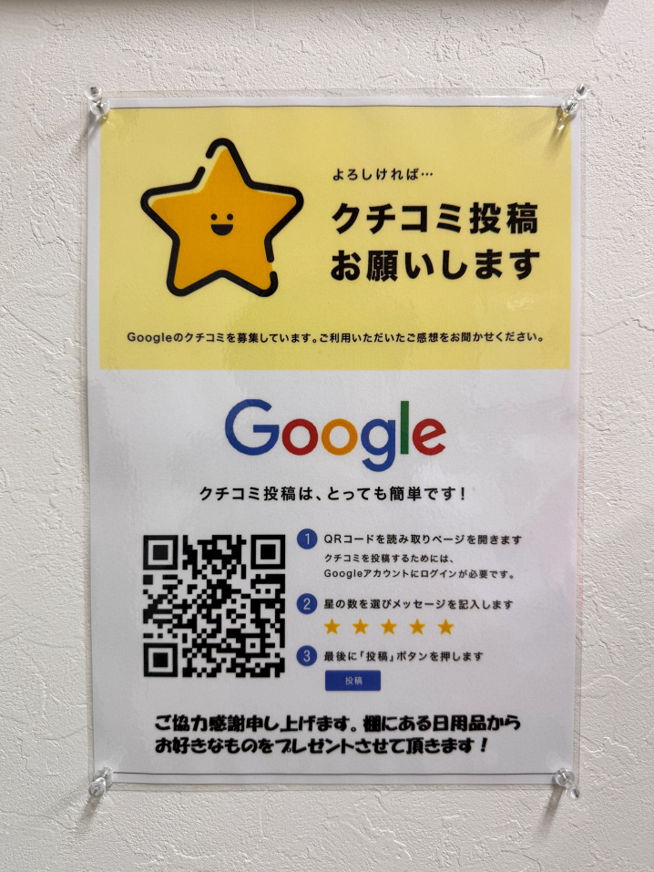 先日からGoogle口コミキャンペーンとして、ご協力いただいたお客様にお好きな日用品をプレゼントしています!